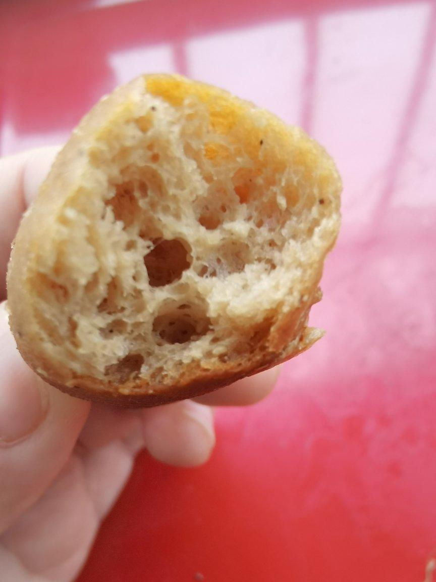 2、这次做了两种,一部分做成了面包条,一部分做成了吐司。可以看出来,面包条发的很好,吐司中间没有发起来。面包条的口感有一点韧,但在接受范围内。吐司的口感很实,毕竟没发起来,就是结实的死面饼的感觉。
