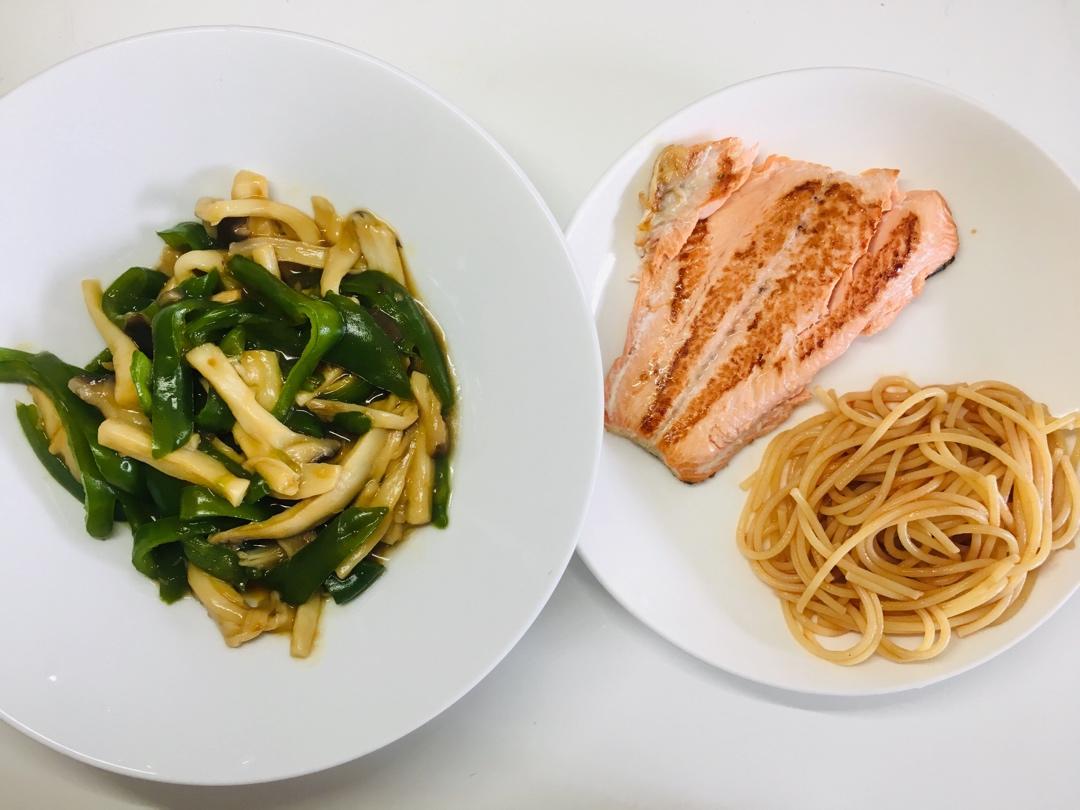 青椒杏鲍菇、煎三文鱼、意面