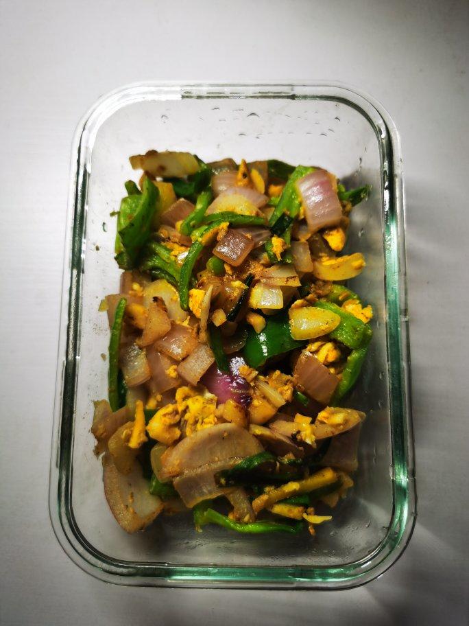 2热油倒入大蒜,倒入蛋液已加盐,煎成蛋饼,倒入洋葱,翻炒,倒入生抽,黑胡椒,翻炒起锅