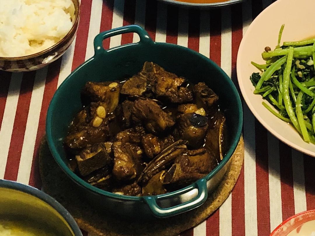 下姜片,排骨,翻炒金黄,下冰糖融化上色,一勺料酒,生抽,老抽,添水炖,收汁倒粗,出锅