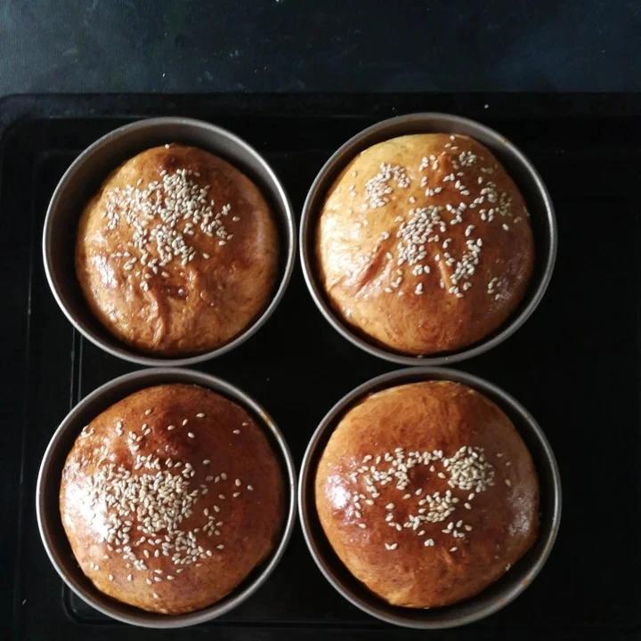 刷蛋液的时候,回缩了。下次要注意这个问题。 早晨做了汉堡,有模具就是好,汉堡胚长的高,切开特别省事。