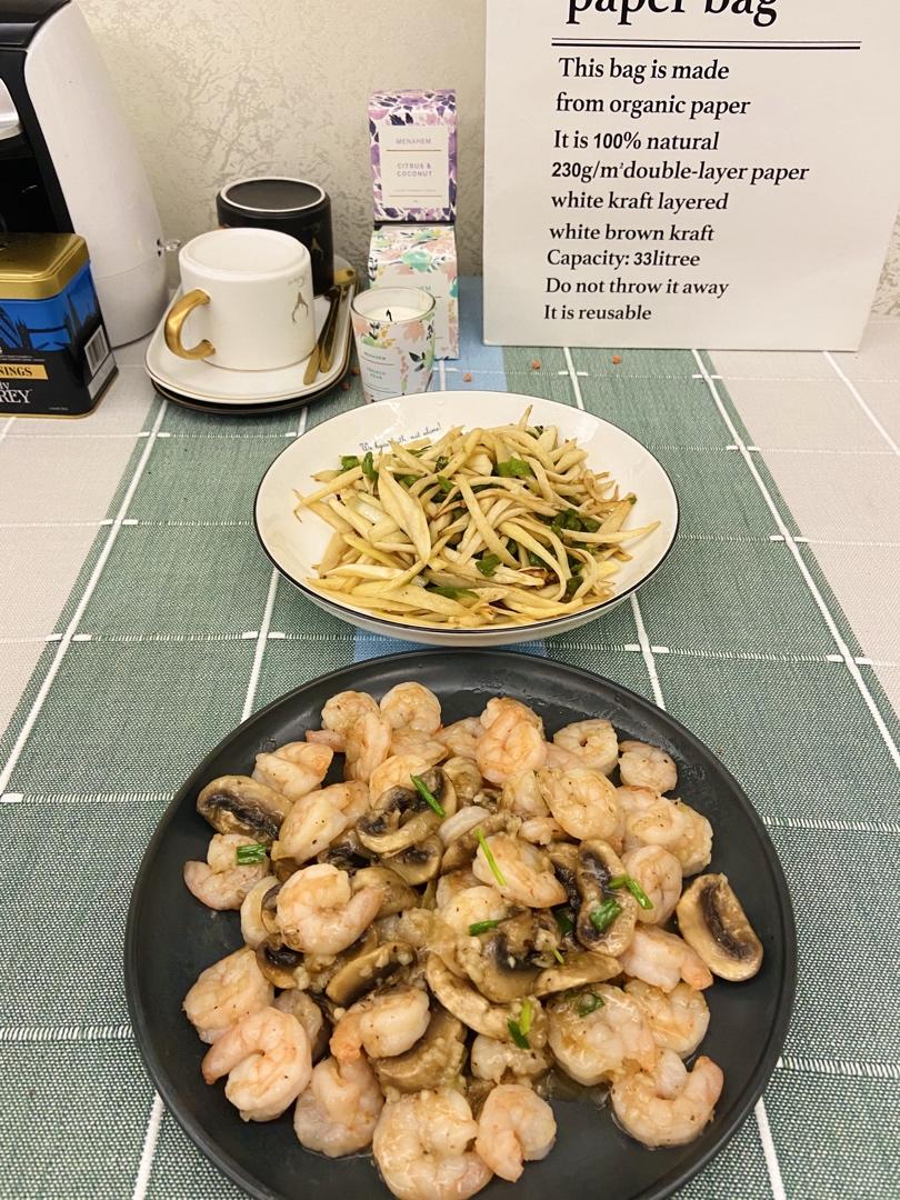 虾仁炒蘑菇 青椒茭白 还有个蒸蛋