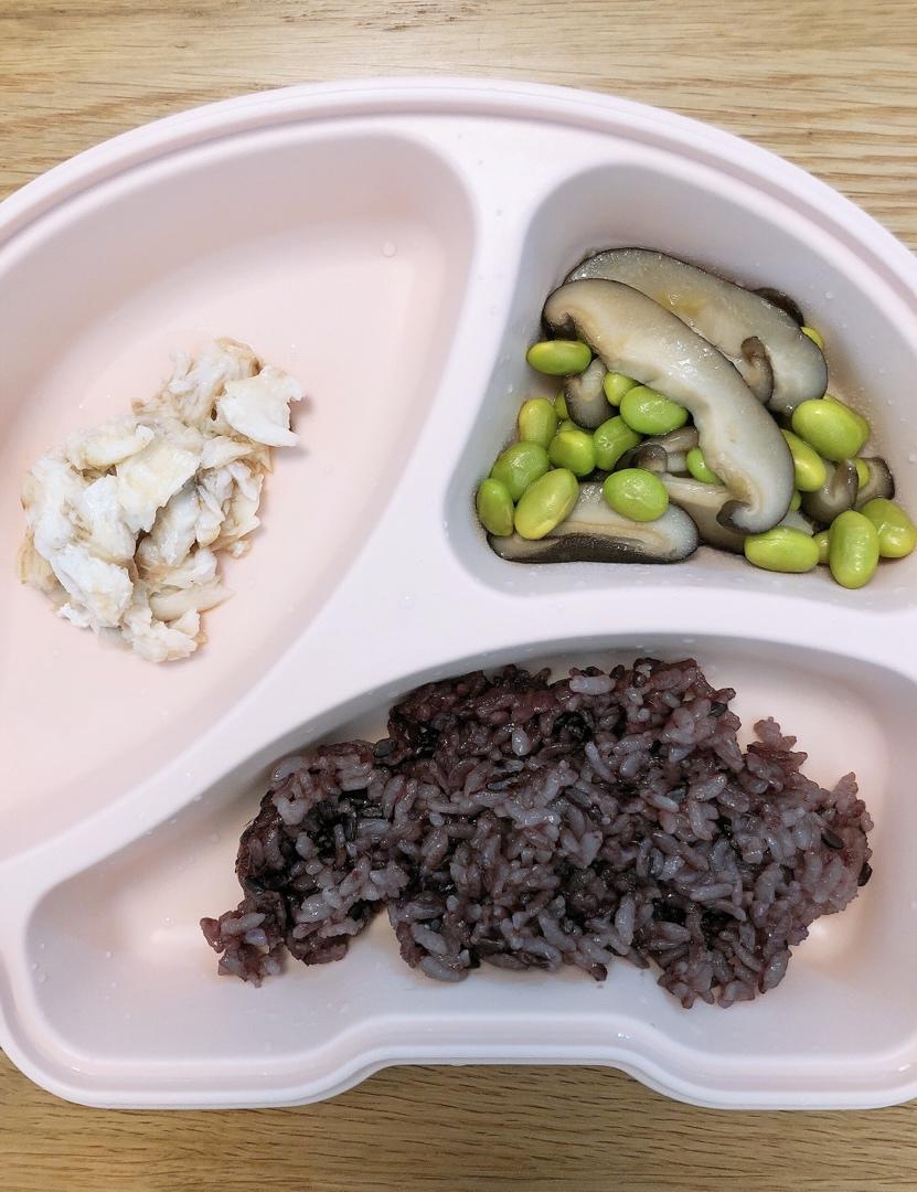 果果午餐·清蒸鲳鱼、香菇炒毛豆、大米黑米饭