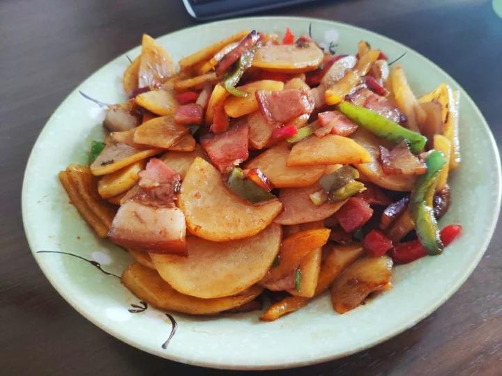 cooktonight 做过 腊肉土豆片 Boczek bacon 很像腊肉,有烟熏味儿,感觉没有腊肉风干的久,肥肉还有点肥。先炒肉,把油榨出来,不用放油,用肉肉的油炒土豆,特别香!老抽是点睛之笔,不能少 2020-05-28