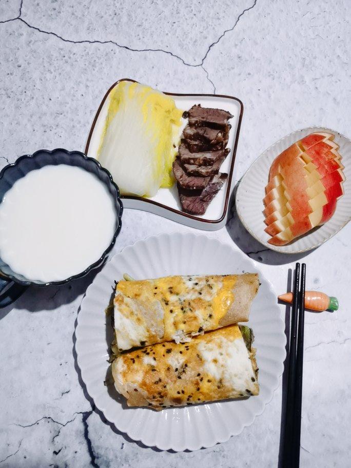 全麦鸡蛋饼,水煮娃娃菜,脱脂牛奶,牛肉,苹果🍎