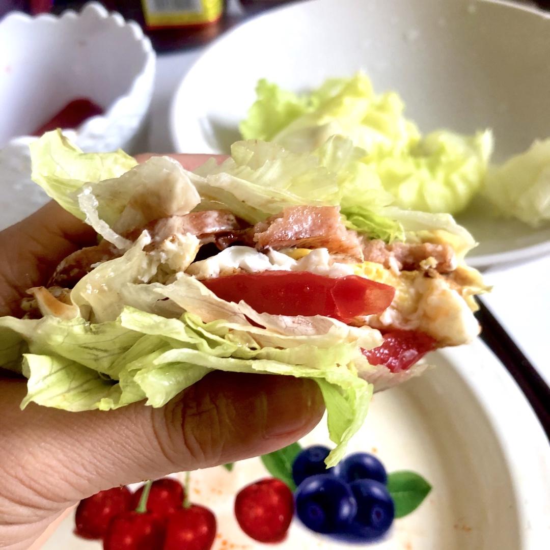 生菜叶N多片、西红柿一个、煎蛋两个、煎午餐肉6小片、洋葱3小片,蛋黄酱、番茄沙司、日式烧烤酱少许,包起来吃!美味又解馋!