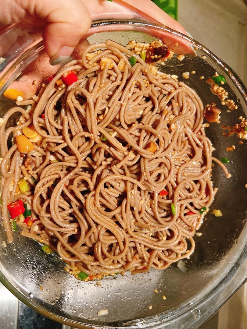荞麦面煮熟过冰水,拌匀