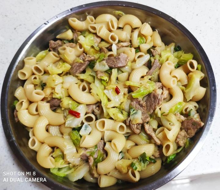 李珺1964 做过 2020年06月12日 #午餐•2020年6月12日# 锅中烧水煮通心粉十分钟,看到胖胖的了,大了很多就可以关火了过凉水备用。锅中放油炒用料酒淀粉抓好的肉片,放葱花,红尖椒,肉🥩变色后加点一品鲜酱油爆香,放入园白菜小块翻炒,加点盐,等园白菜熟了再放煮好的通心粉继续翻炒使其入味,最后放点蚝油就可以出锅了。图片五张 2020-06-12