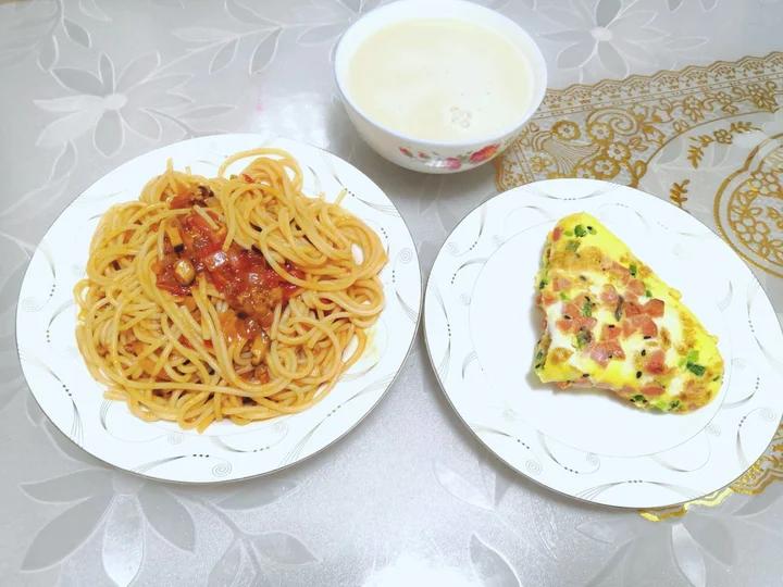 番茄肉酱意面、鸡蛋饼、红枣豆浆