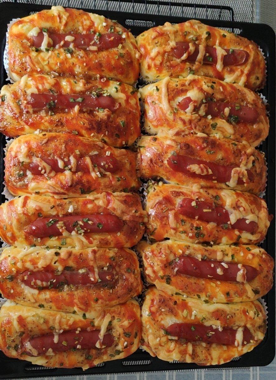 悠扬--01 做过 热狗香肠面包 按照方子可以做75克左右热狗面包12个,38L的烤箱满满一满盘。今天多揉了一会儿面团,终于做出了传说中的手套膜。感觉用一根烤肠切半做出的型更漂亮,加了一些芝士,小葱用吸水纸吸干。松下烤箱,上下170度预热8分钟,烤了21分钟后转上下150度10分钟,提前三分钟采用风热让满盘均匀受热上色,感觉比以前的成品有进步! 2020-07-01