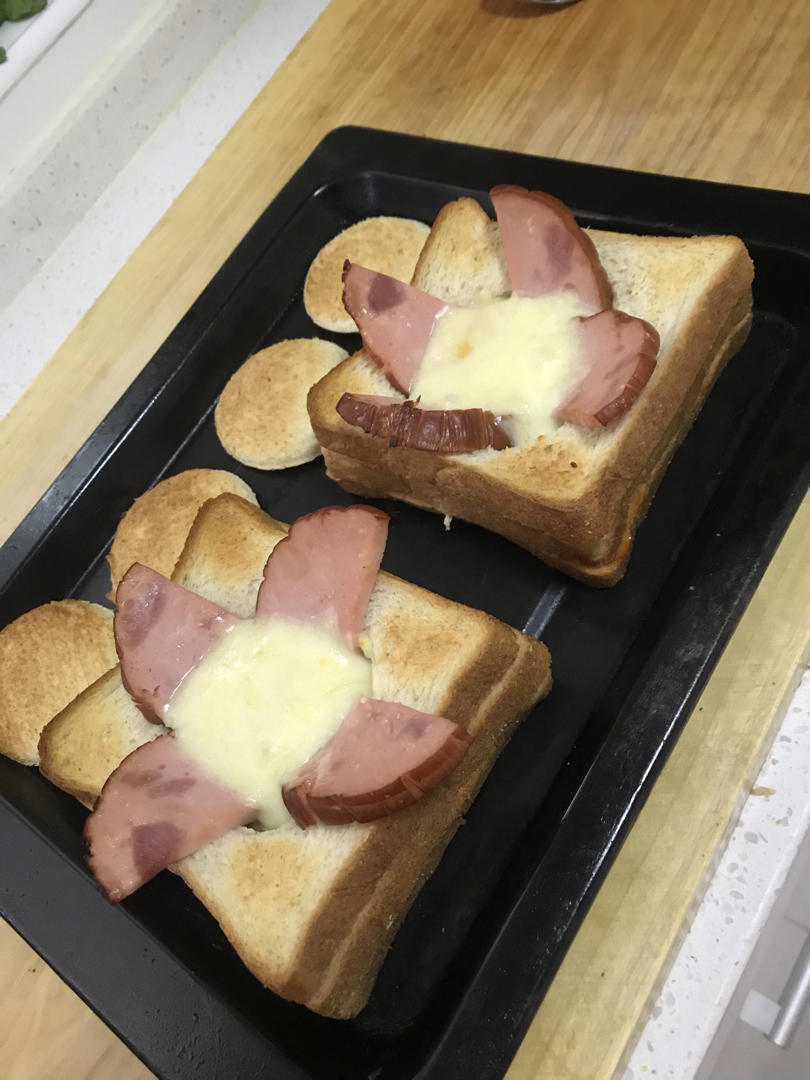 这个跟淘宝里学的,三层,但是里面的鸡蛋不熟,第二张多烤了会,还是不熟,下次可以先撒芝士再放鸡蛋试试!