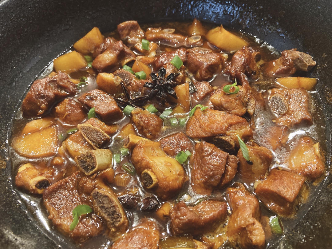 起锅:小火起锅,加入油和冰糖,待炒出糖色,加入排骨均匀上色。加入姜和葱,翻滚使其均匀受热。