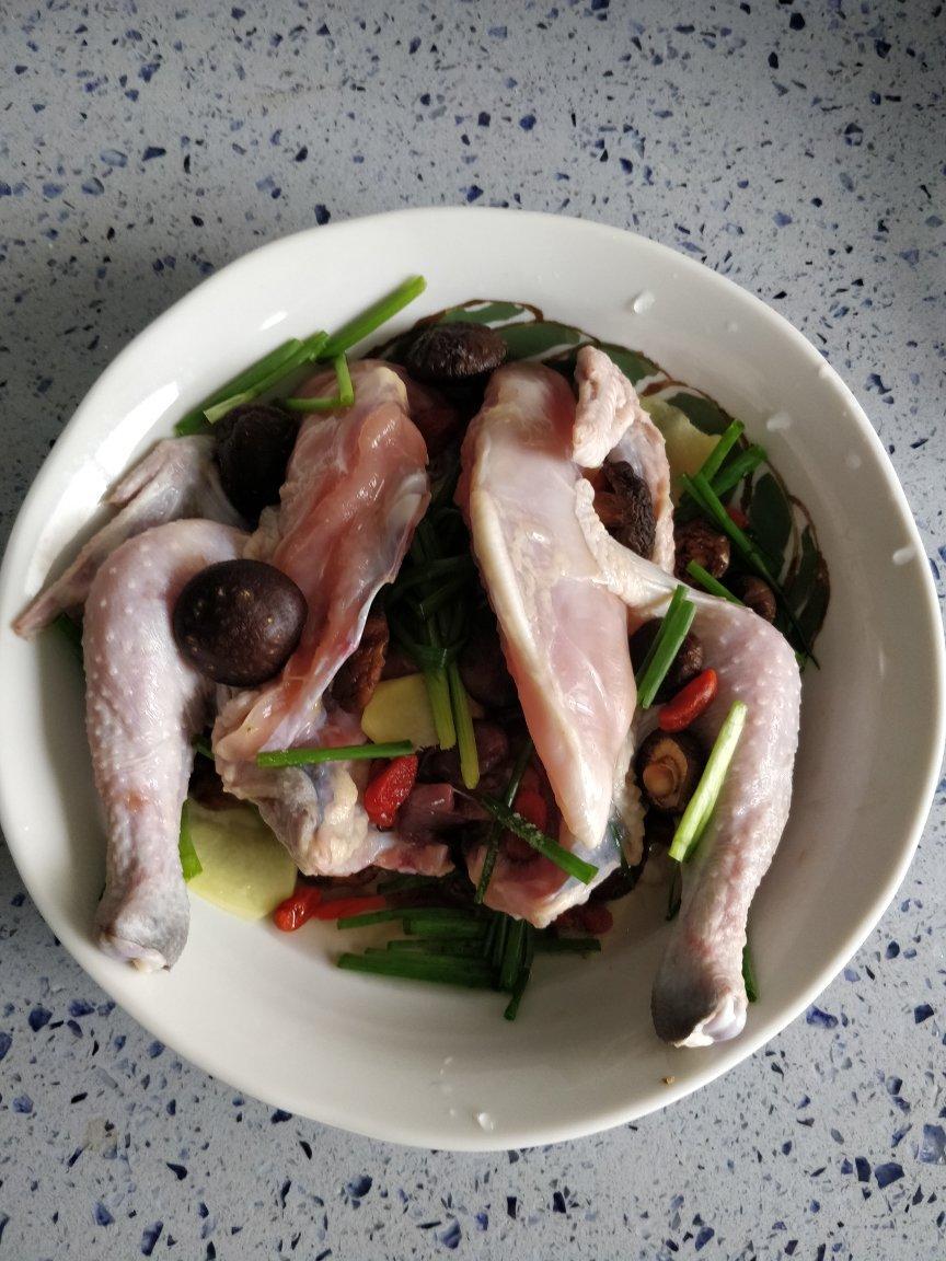 新鲜童子鸡一只洗净待用;用盐和味精适量涂抹全身,做一个马杀鸡;内脏洗净放入腹部,接着放生姜,葱结,泡好的香菇,加入适量黄酒静置片刻;碗底放数枚泡好的香菇,放入整鸡,枸杞,红枣,生姜,葱段,少量糖和油,延碗边加入一小碗水;锅中放水烧开后转中小火上碗蒸一个小时,关火开吃。非常鲜嫩,🤗🤗😋😋