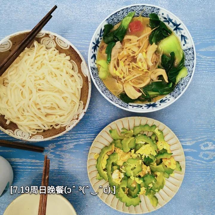 周日晚餐:苦瓜炒鸡蛋,酸萝卜鸡汁煮菌菇上海青,父子俩的面条,我的蘑菇亦餐。