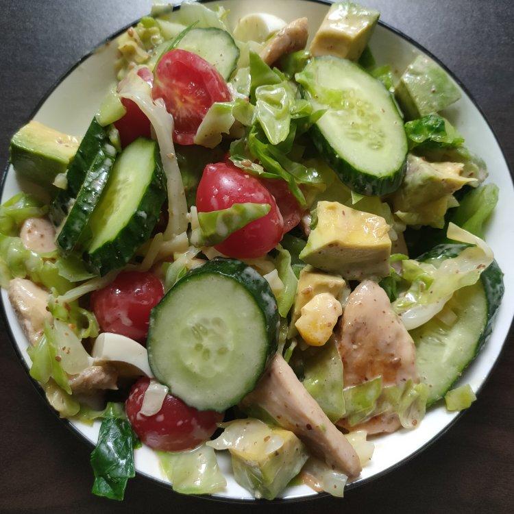 晚饭就沙拉吃吃吧~ 鸡胸肉煎的很好 蔬菜也很好吃 唯独不喜欢牛油果呜呜 下回不吃了