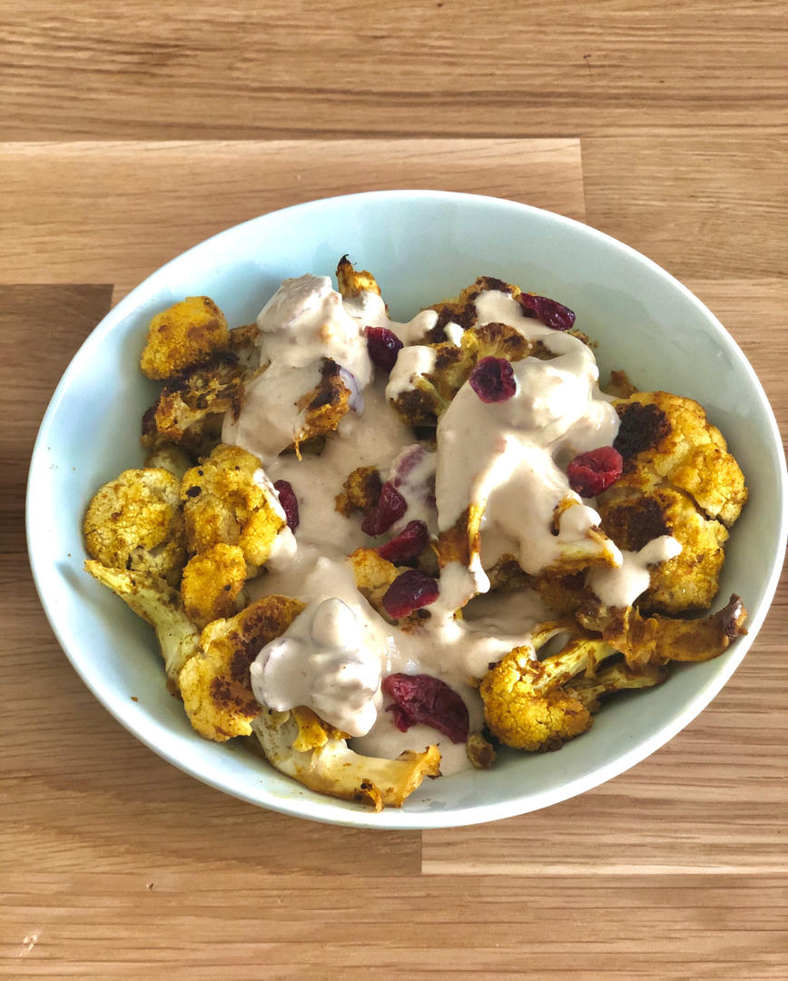 1_baby_lunch 做过 蔬菜 补发好久之前做的小菜~咖喱粉橄榄油和菜花混吧混吧入烤箱烤熟,出炉后顺手来一个tahini加青柠汁和蔓越莓的小酱 不知不觉吃了好多蔬菜!#蔬菜# #一人食# 2020-08-01