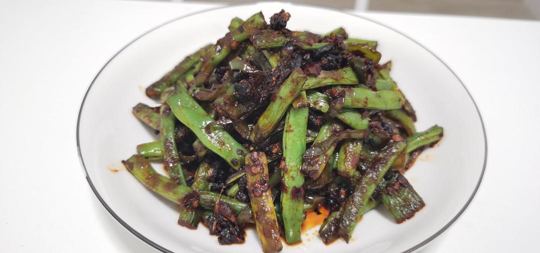 四季豆去头尾,去两边筋,开水烫3分钟变色,沥干水,热油蒜末翻炒,倒入四季豆,翻炒,倒入辣椒,,生抽,老干妈,少量醋,盐起锅。