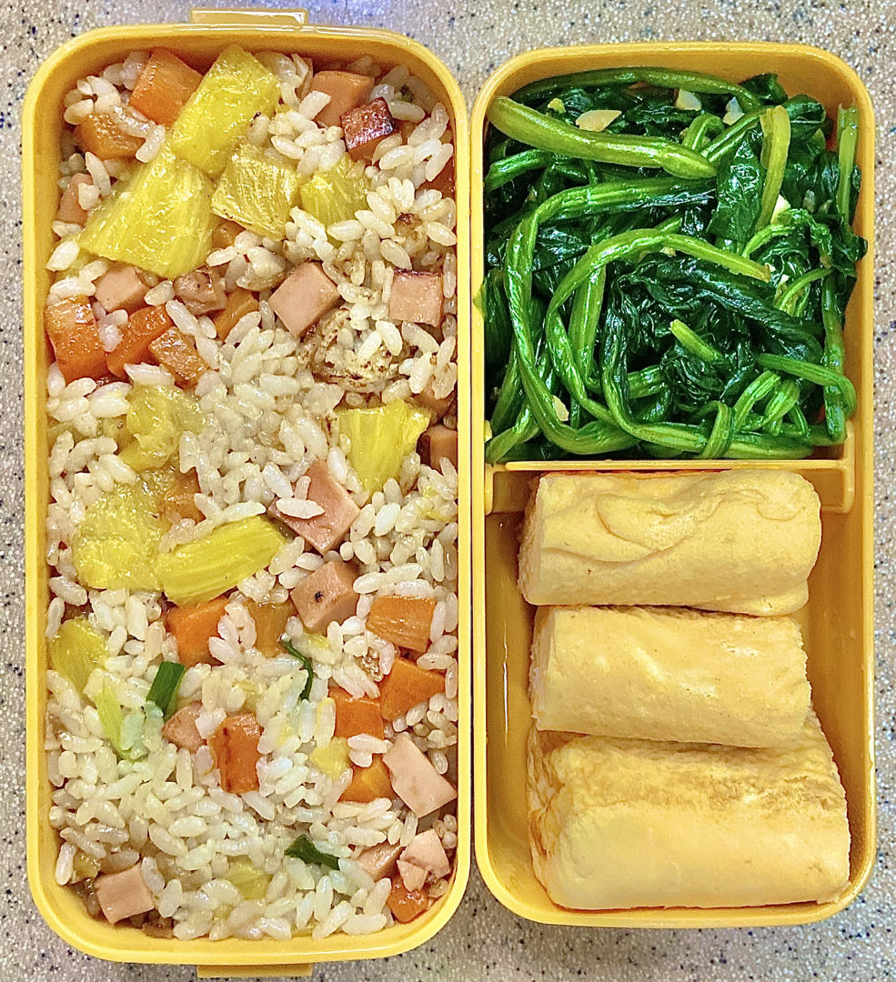 玉子烧,凉拌菠菜,菠萝火腿炒蛋饭