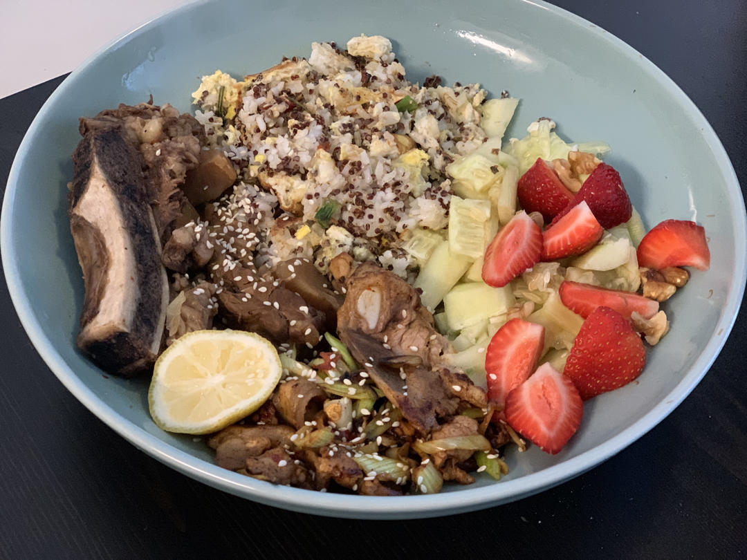 蒜苔炒回锅肉+卤牛骨+醋渍小青瓜草莓+蛋炒藜麦白米饭~