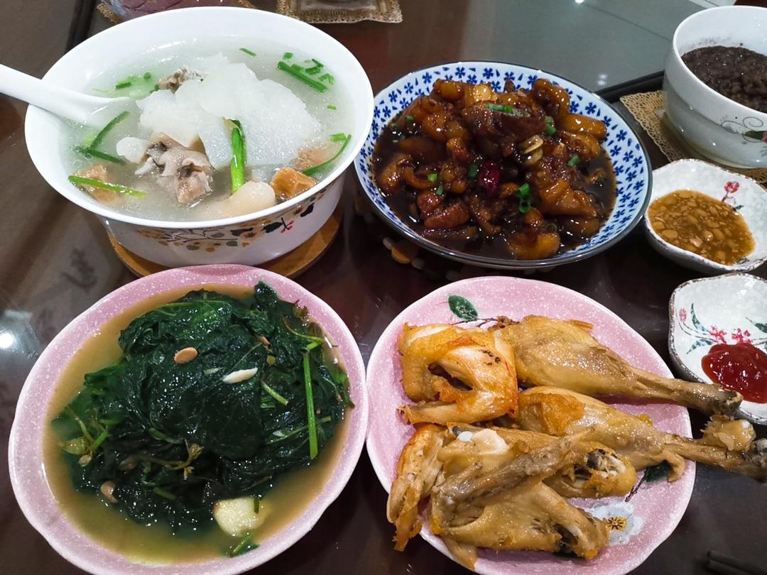 午餐:冬瓜汤+甜醋猪蹄+香煎白斩鸡+金不换炒地瓜叶