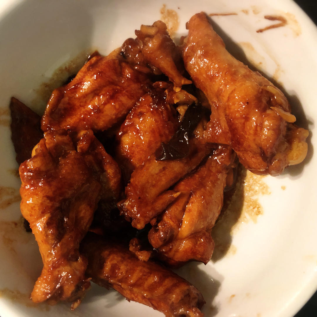 前几天晚上饿了就找了这个菜谱把三个鸡翅烧了,很好吃,我没控制好生抽和酱油的量加多了所以有点咸,配泡饭吃刚好。谢谢分享~