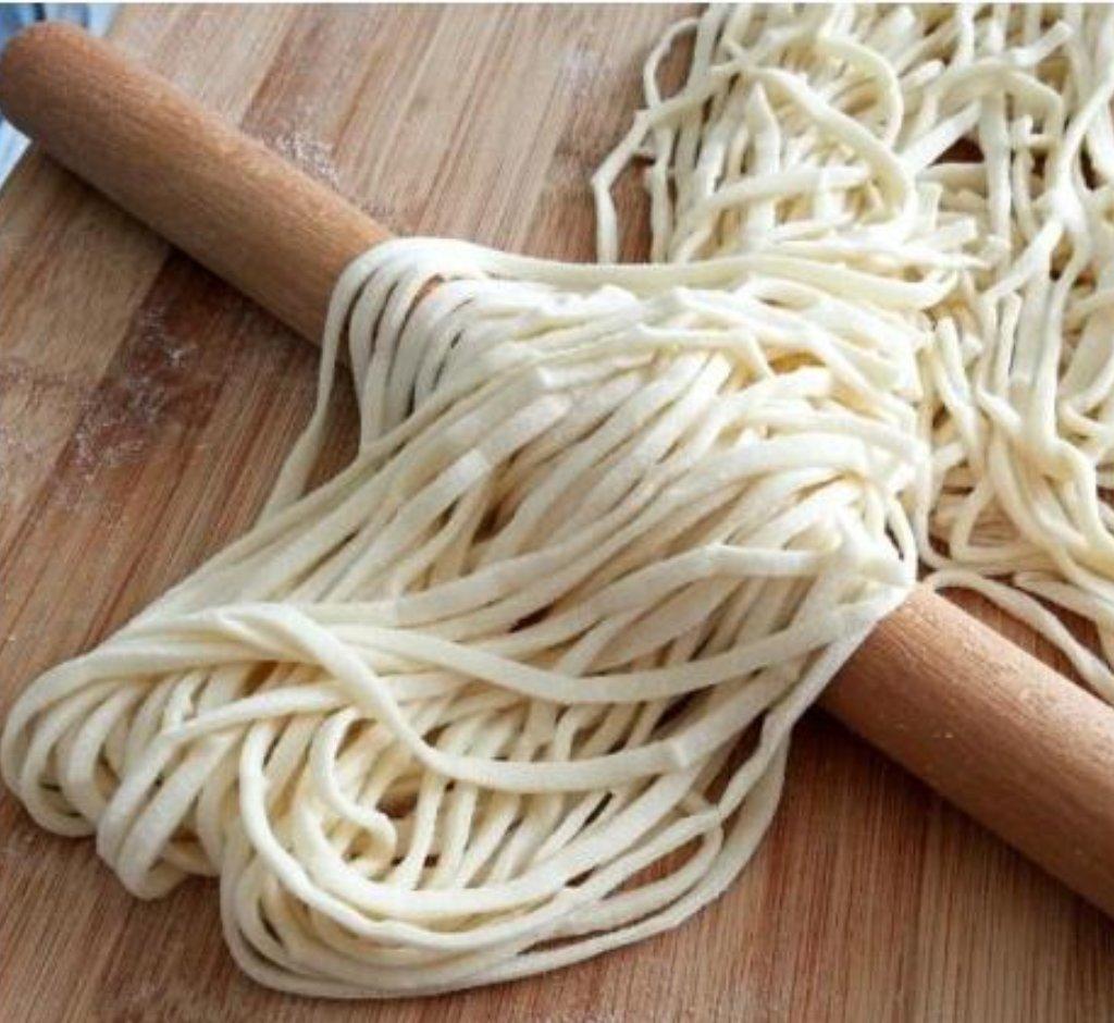 100克面粉冷水活面饧面2小时后擀开切。这是一个人吃两顿的量。