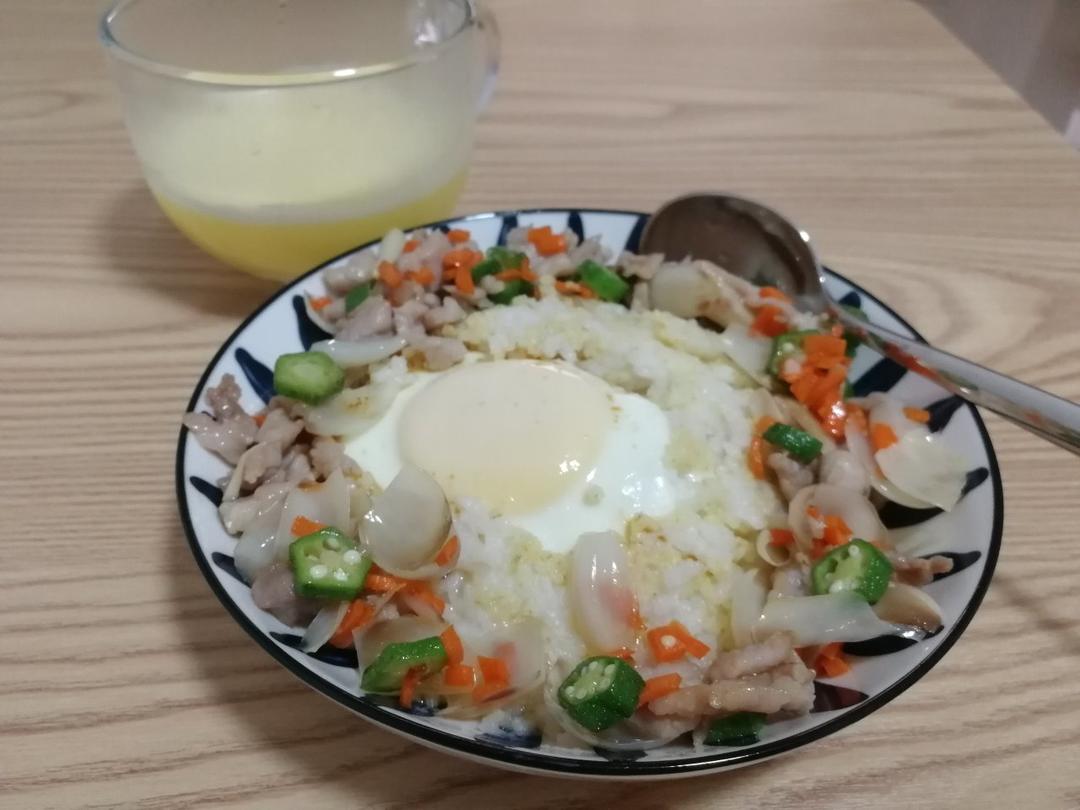 早安😊百合肉沫红萝卜秋葵鸡蛋拌饭、雪梨杏仁南瓜汁