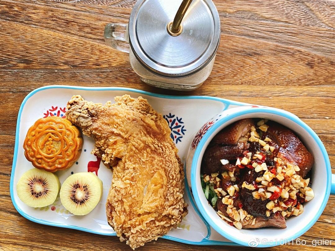 一人食:生活的仪式感,中秋食月饼:松仁金花火腿🥮&手枪腿&红心奇异果&金陵烤鸭&冰拿铁☕️.
