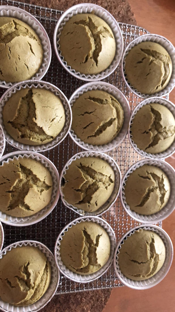 左-抹茶蛋糕/右-香蕉蛋糕。小纸托,一炉满满14个。 130度15分钟(几经尝试后最适宜的烘烤温度和时间。出品模样很好哎)