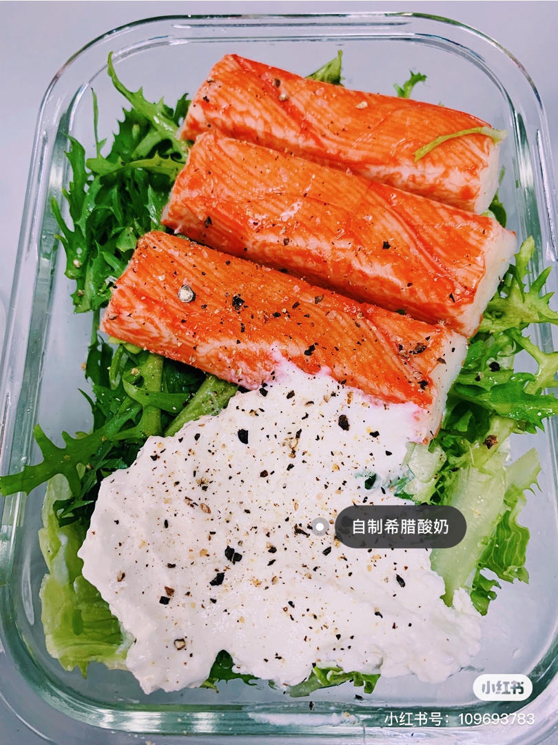 今天是第一天,按说要让自己有点饥饿感,以便快速消耗体内的糖份。但是那个过程不开心,所以我给自己准备了可以满足口欲和情感的沙拉🥗,用的是自制的希腊酸奶,加海盐胡椒,真的是别有一番风味。蟹棒的存在就是完全就是满足自己的馋😋