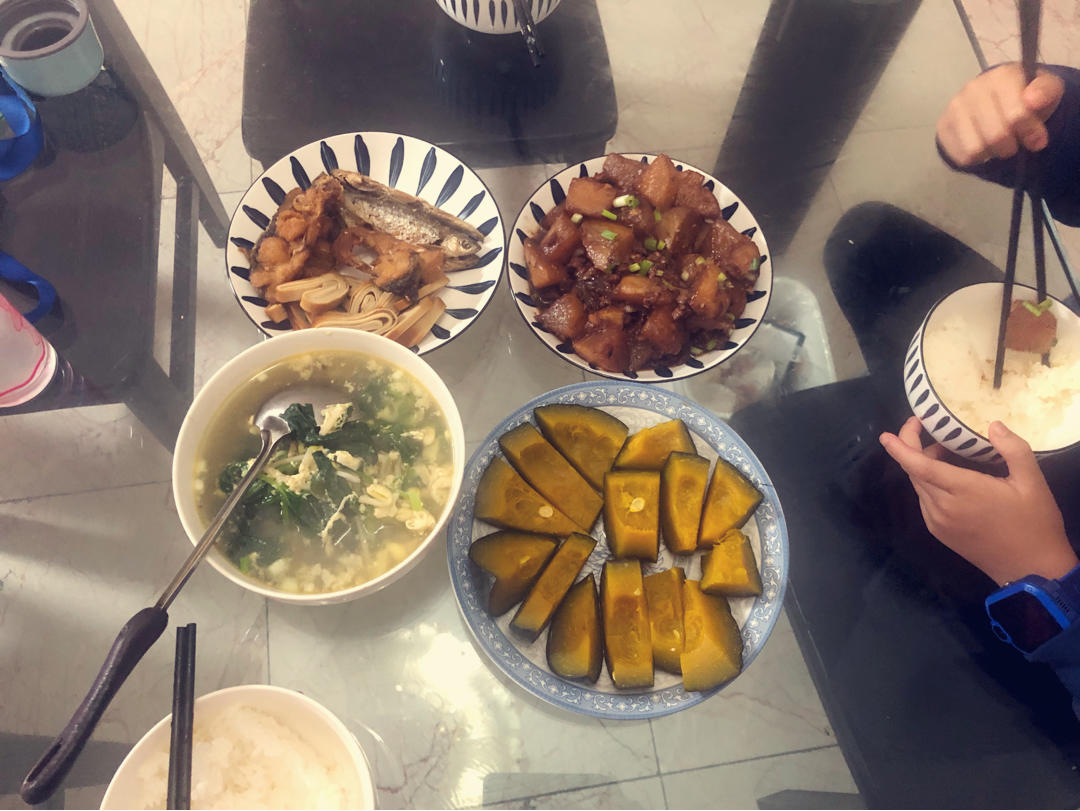 这也是十一后给我嫂子和侄儿做的饭,烧萝卜,蒸贝贝瓜、炸小鱼(别人给的)豆腐皮(买的)