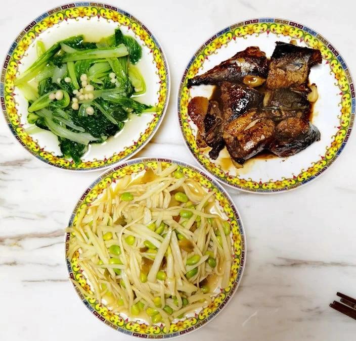 晚上也是一个新菜:红烧马鲛鱼。以前吃过妈妈烧的,战战兢兢自己下手,不知道会成啥样。按着一般红烧鱼的做法,居然也差强人意,连儿子也赞,这鱼还不错。