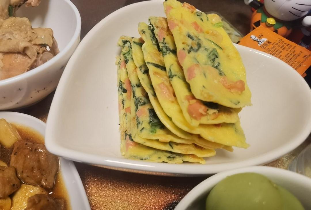轻风_淡云 做过 菠菜早餐饼 宝宝辅食食谱 用火锅吃剩的一点点菠菜,再放点山林红肠丁,三个很小的鸡蛋,还加了一点点水,全程小火慢煎。自己觉得很满意,也很简单快手。#午餐•2020年10月25日# 2020-10-25