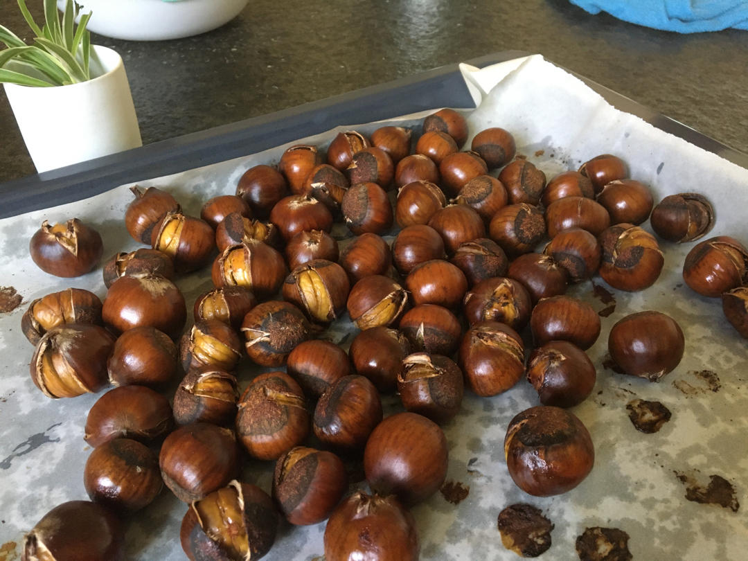 烤箱200度/30分钟左右(根据烤箱、栗子大小),开口(观察)、粉糯(尝一个)