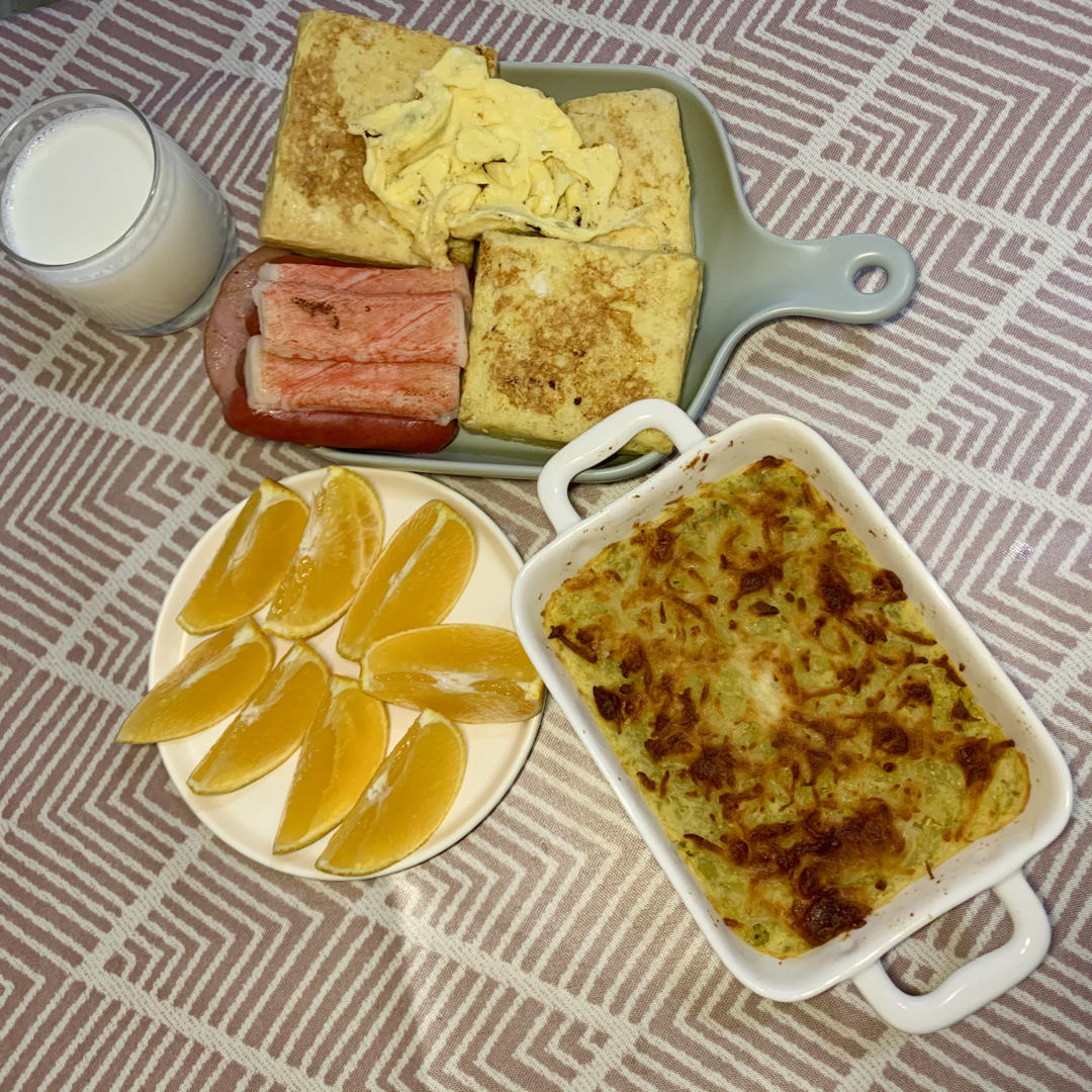 酸奶火腿西多士➕芝士焗红薯➕煎蟹棒/烤肠➕牛奶