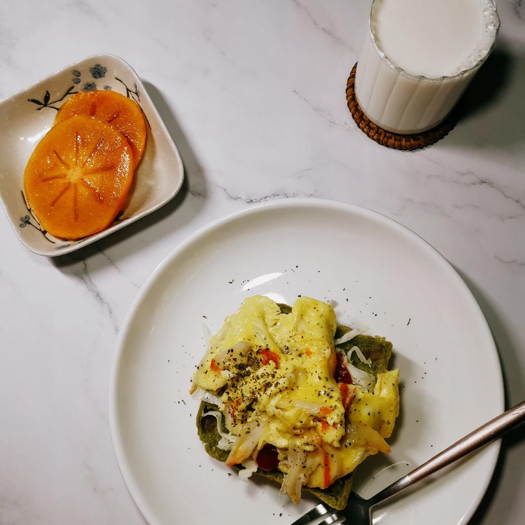 蟹柳滑蛋,脆柿,牛奶。