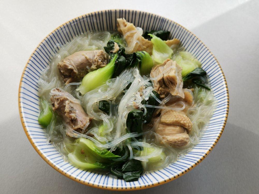昨儿剩的老鸭汤加了一团粉丝和一大颗青菜,好味即成😊
