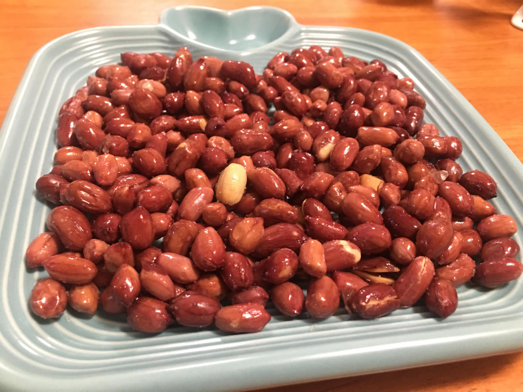 花生米,放一丁点儿油,10分钟,中间颠一次锅子。