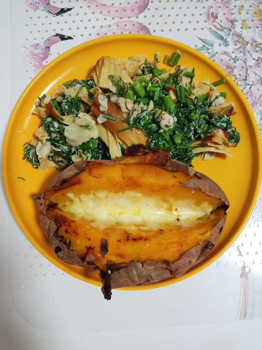 芝士焗红薯,虾仁鸡蛋豆皮炒茴香