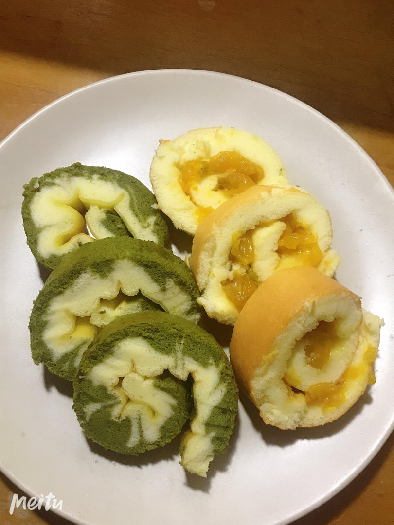 今天做了两盘蛋糕卷,第二盘按方子的一半分量,抹茶3克,放22×17的深盘做,有点太厚了。用了一个烤盘挡底火,深盘直接放烤盘上,底下焦了。因为上一盘90度12分钟就上色,所以这次预热后一直在90度一下烤了10几分钟,发现绿色好难看出来上不上色。总20分钟的拿出来按压有沙沙声,不粘手,被我转向塞回去继续烤了5分钟。出来没有晾干就盖油纸,已经有点掉皮。趁热卷,太厚好难卷还开裂,冻过后掉皮一半。吃的口感比上一盘干,有点咸,打发蛋白加盐太多了,抹茶味道适中,用筷子画的花纹也成功了。结论就是不能一直低温烤。我的烤箱还是90度10分钟为基础好了。