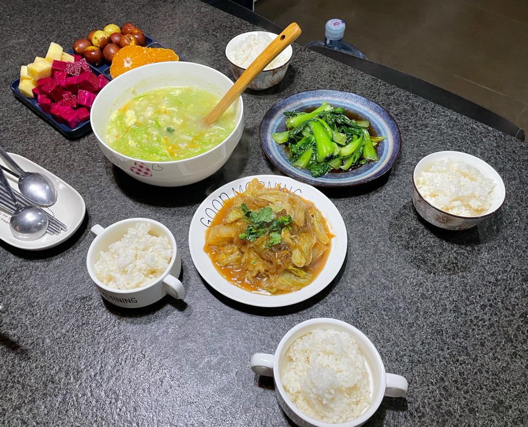 晚餐🥣:白菜炖粉条、素炒油菜、萝卜疙瘩汤