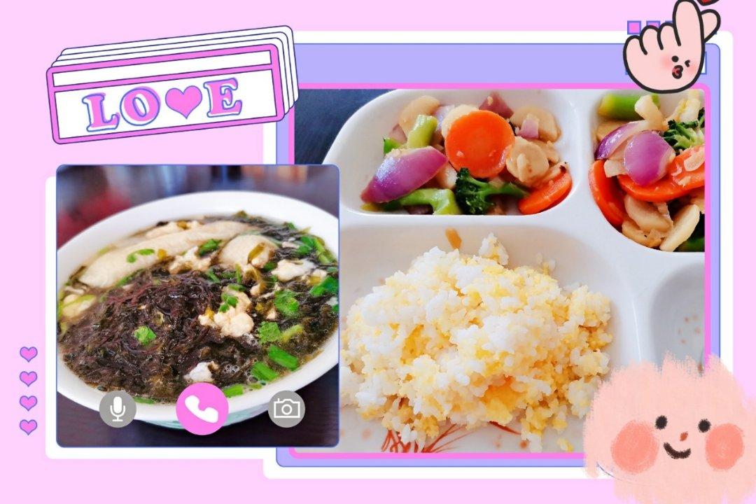 炒杂蔬(山药、西兰花、胡萝卜、洋葱)+紫菜蛋花汤(紫菜、鸡蛋、豆腐皮卷)+二米饭(玉米碴、大米)