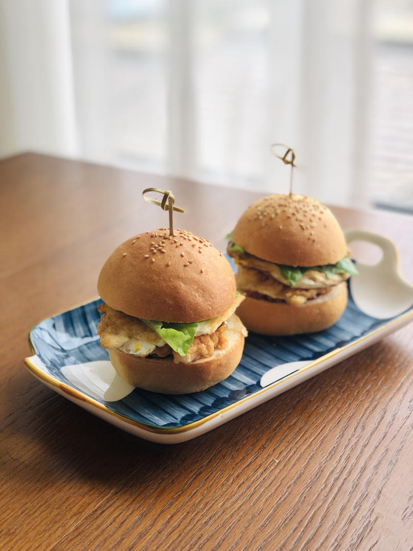 自己炸的鸡排,自己做的蓝莓酱,加煎鸡蛋和生菜,我女儿说这是她吃过最好吃的汉堡包🍔