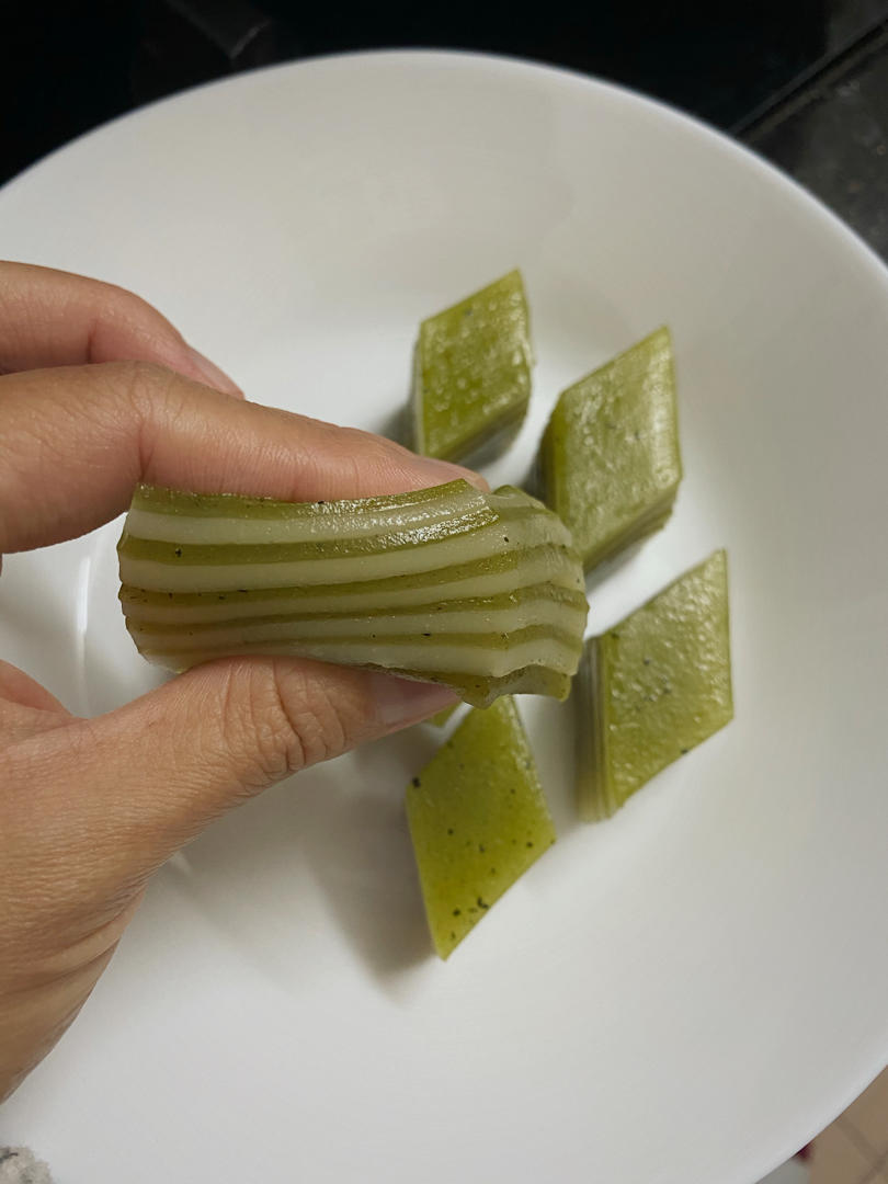 mia-min-min 做过 印尼斑斓椰汁九层糕 或许是用新鲜斑斓汁替代了200克椰浆的原因吧,虽然很有弹性,但是很黏~很粘手(´・Д・)」蒸好后放凉3小时还是挺粘刀的,或许下次用其他牌子的粉试试,冷藏过后会稍结实些,更有嚼劲! 2020-11-27