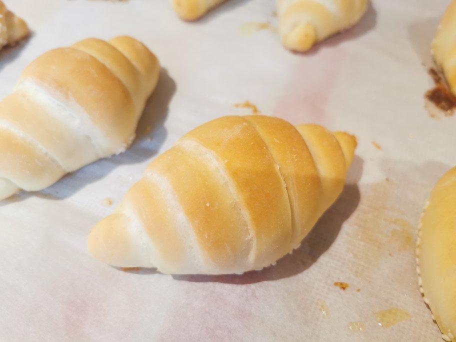 临时想做盐可颂,没有有盐黄油,就加了些芝士粉,卷成了圆胖形,萌萌哒