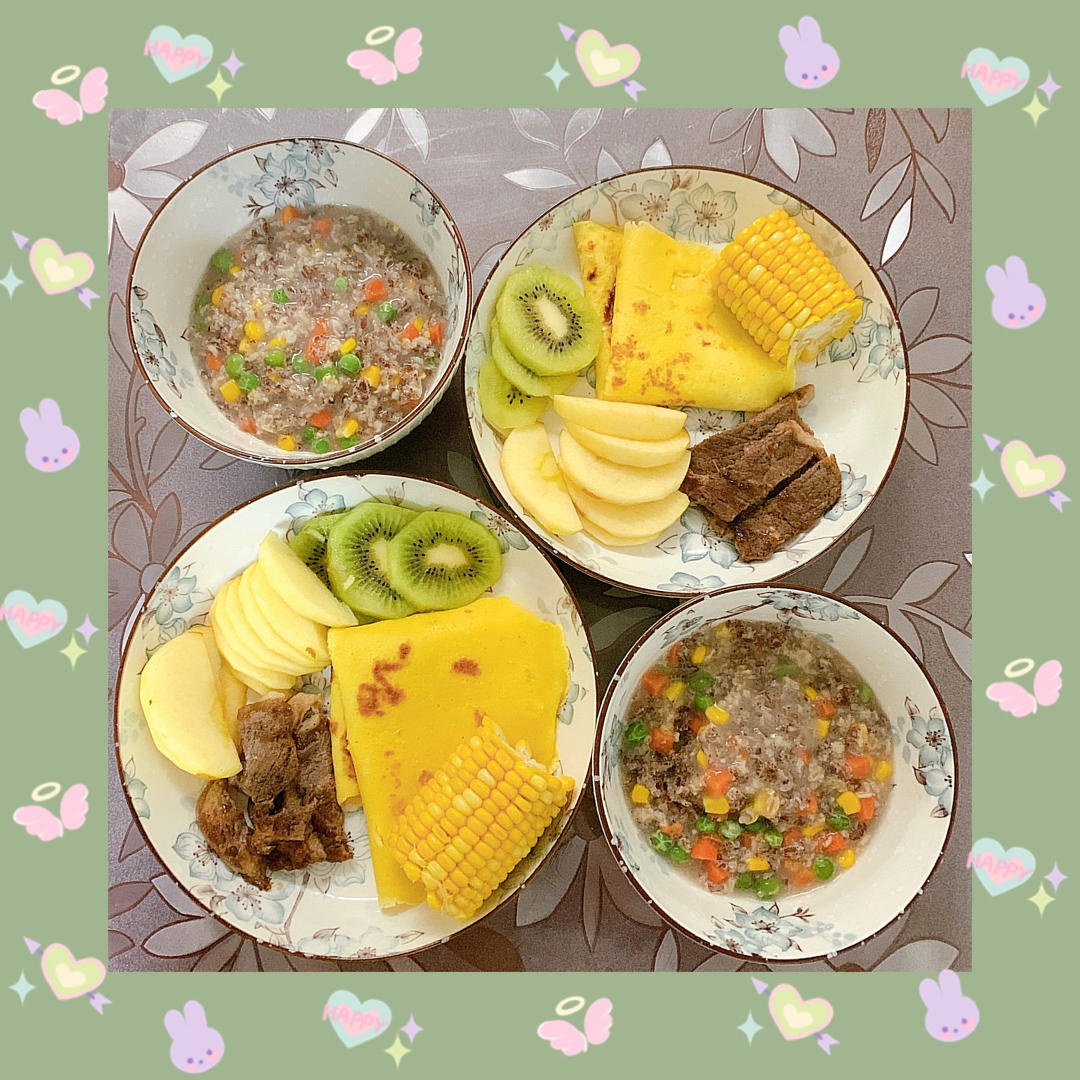 鸡蛋饼+玉米+牛排+杂蔬燕麦粥+水果