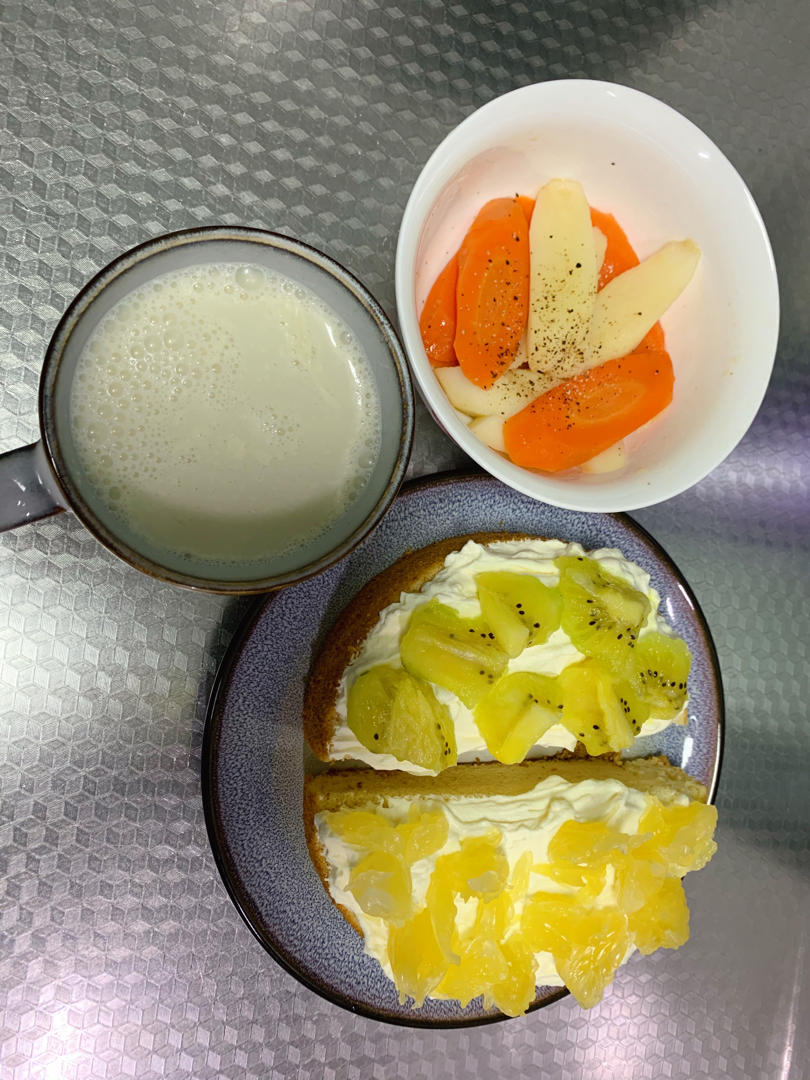 豆渣戚风抹奶油加水果,天冷了吃这个有点凉