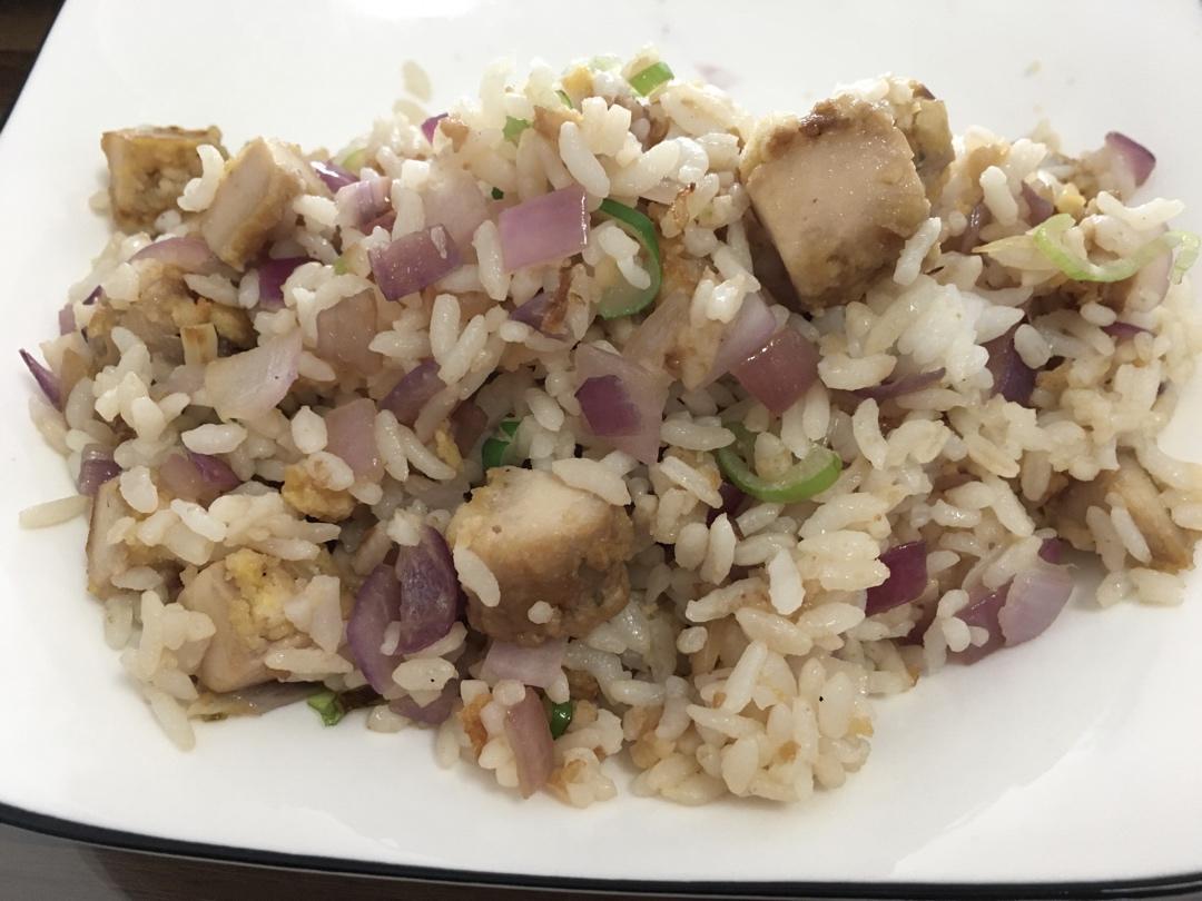 洋葱炒香,加熟鸡胸肉丁和葱翻炒,