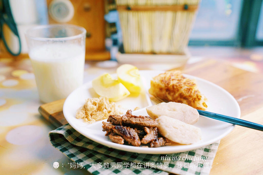 牛妈厨房6 做过 早餐•2020年12月9日 改变从撅着嘴巴生气开始,平时牛奶最后喝,冷了不养胃,今天跟他说好,必须喝了牛奶再吃其他的东西了,一点小小的改变都能让他撅着得嘴巴生气,看样子是皮痒的节奏。不过我还是得坚持着,没2分钟牛奶一杯喝完,马上开开心心地吃着其他东西。今日份早餐,牛奶,牛排,鸡蛋饼了苹果肉松及芋头。#早餐•2020年12月9日# 2020-12-09