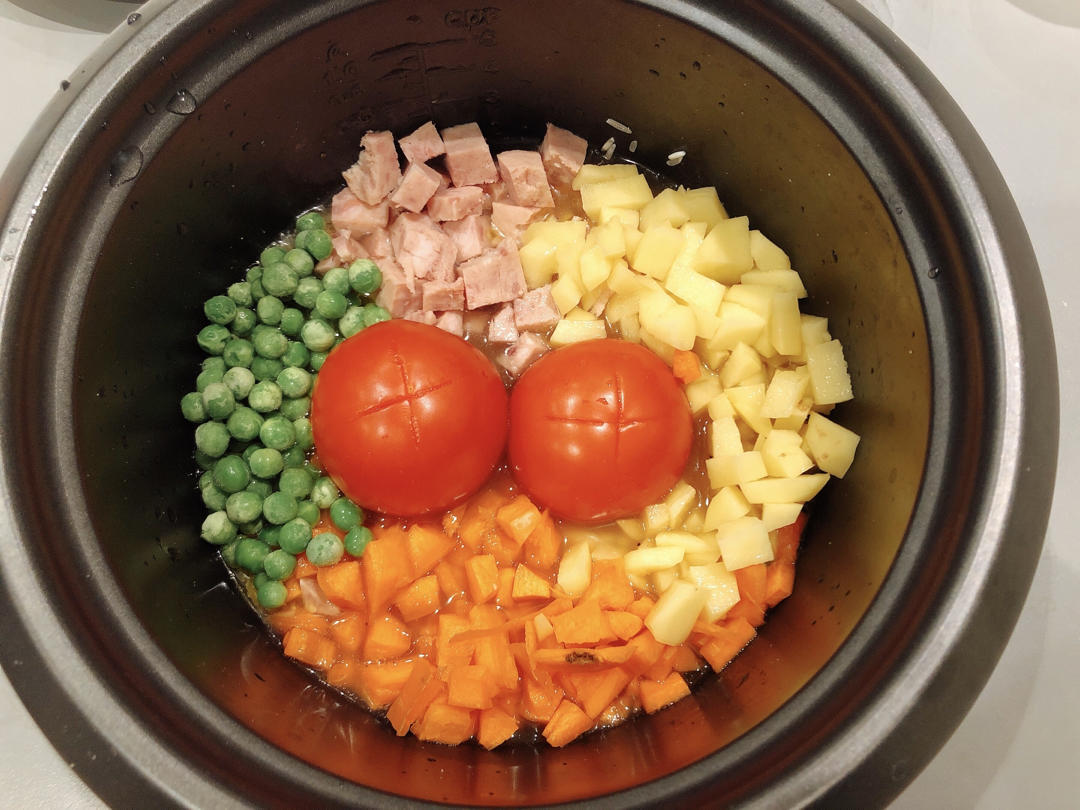 1. 食材切丁,肉类的话最好放腊肠(香),胡萝卜土豆入锅煸炒一下会更香,不炒也没事,番茄切十字